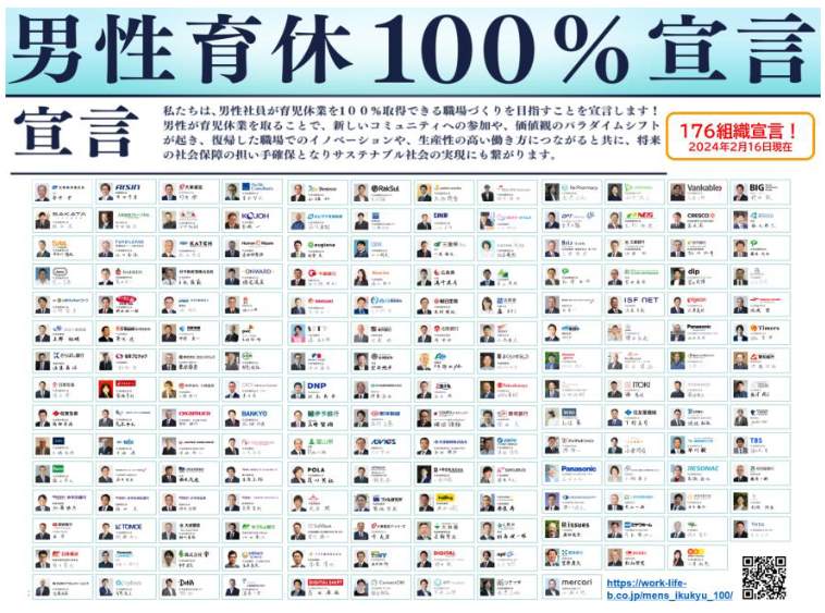 企業規模や現在の取得状況などは問わず、将来的に男性であっても育児休業が取得しやすい環境の実現に経営者としてコミットすることを明示するためのもので、2024 年 2月 16 日の時点で 176 社の宣言が集まっています。