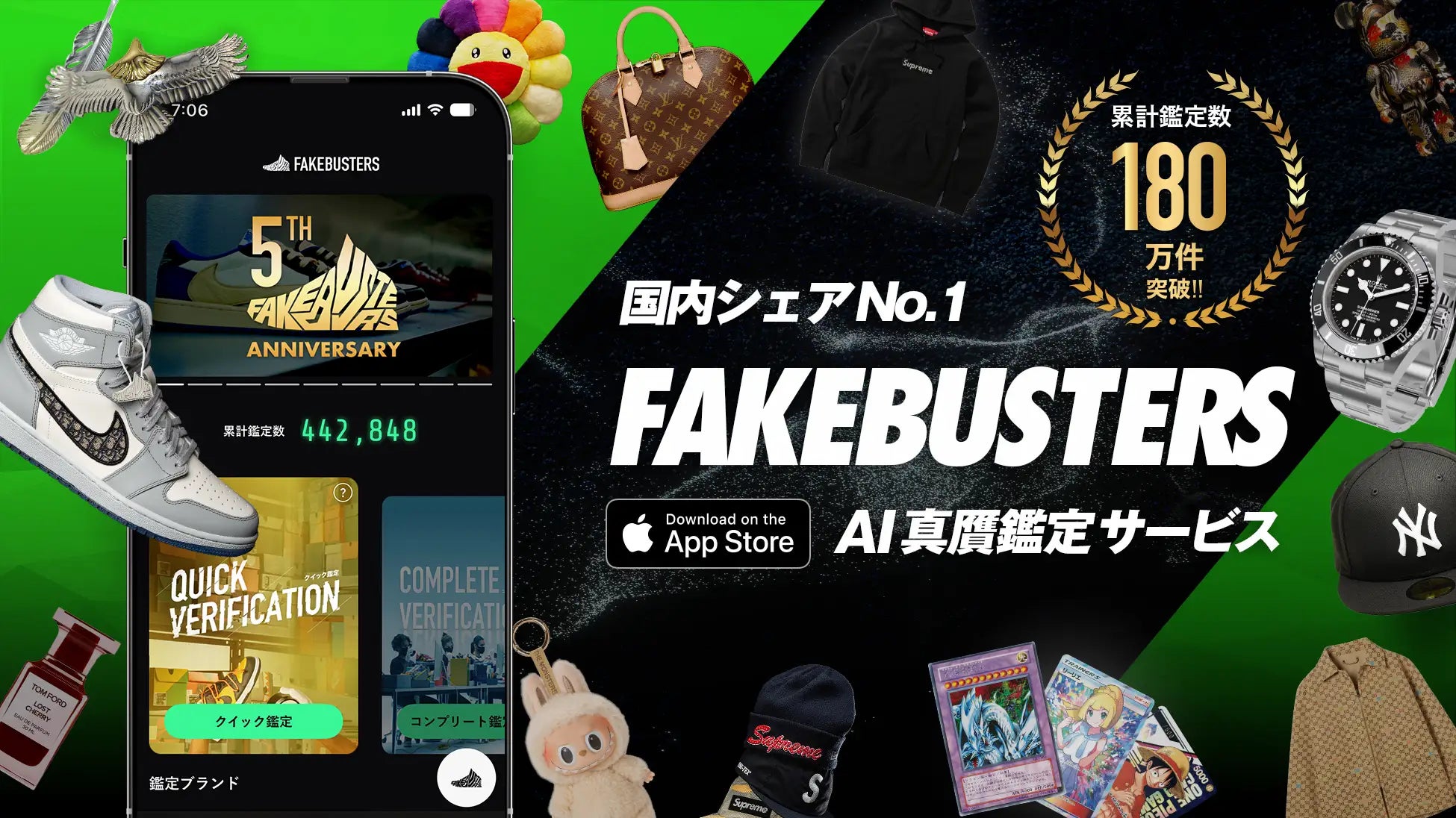 「フェイクバスターズ」は、偽造品が多く流通している約300ブランドを対象とした、累計鑑定数180万件を超える国内シェアNo.1(※1)のAI真贋鑑定サービスです。膨大なデータ基盤と豊富な鑑定ナレッジから開発されたAI鑑定に加え、多彩な経歴を持つ鑑定チームと最新鋭の専門機器を駆使して、正確かつ迅速に鑑定を行います。