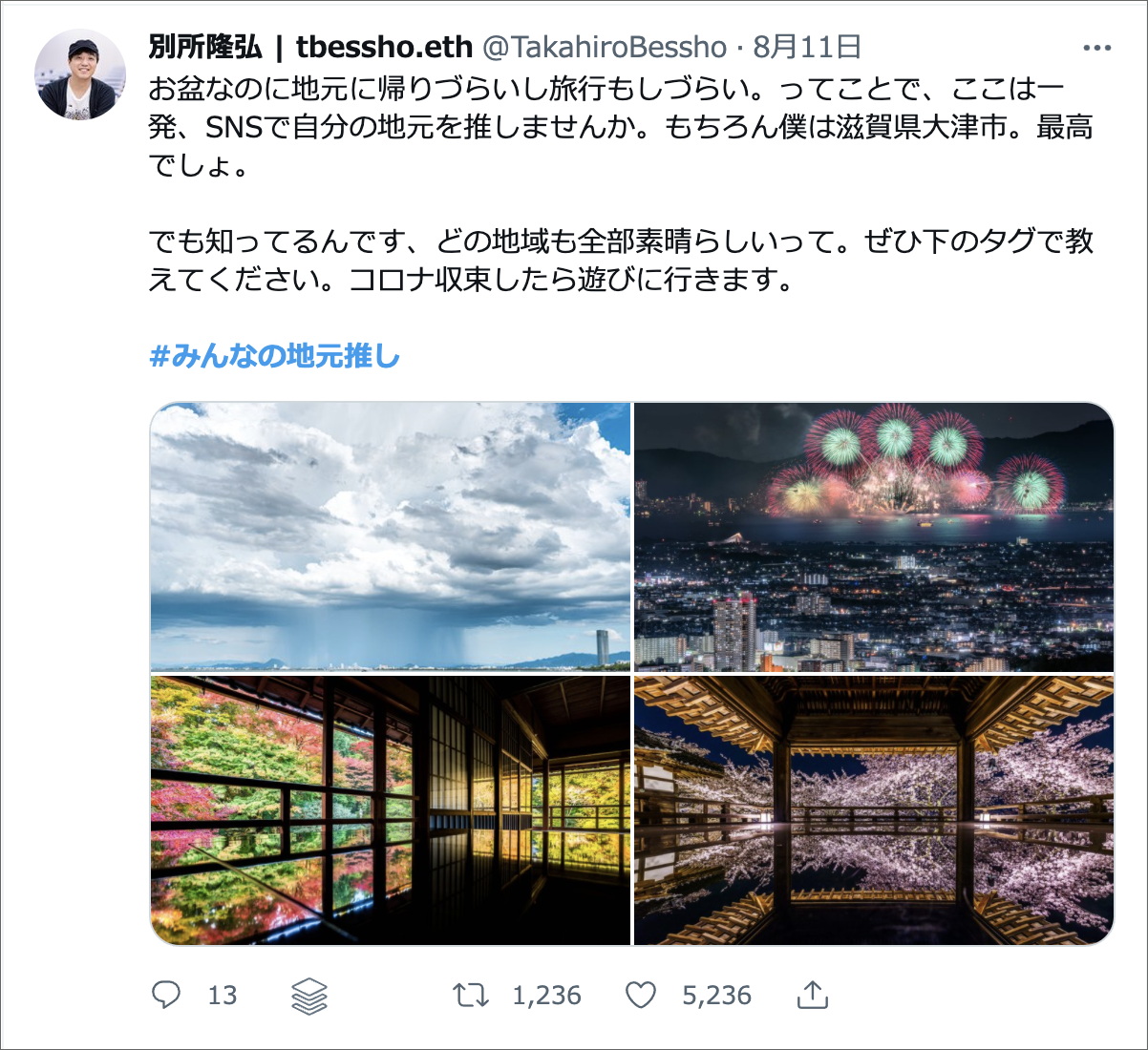 コロナ禍で地元への帰省や旅行がしづらい状況が続くなか、別所氏が「SNSを利用して自分の地元を推しませんか」と呼びかけたところ、多くの賛同者が写真をSNS上にアップ。共感が広がり、現在も使われるハッシュタグとして、ひとつのムーブメントになりました。