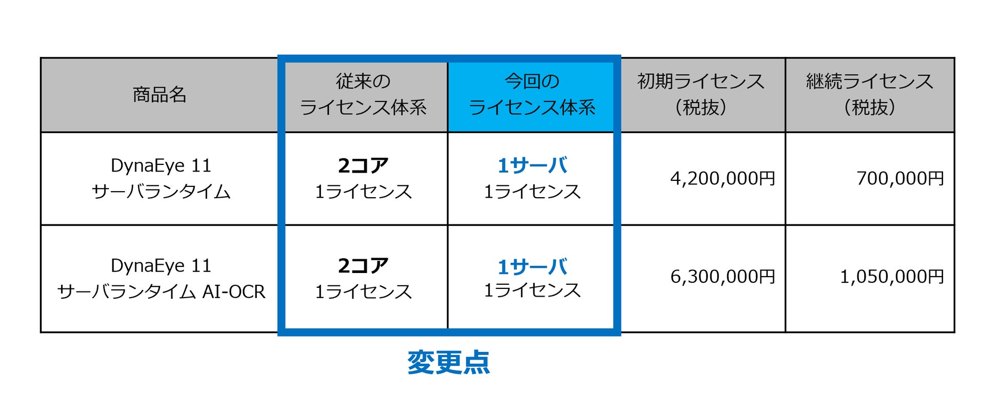 今回、当社はお客様のニーズにお応えするため、より多くのお客様にDynaEye 11をご利用いただける新しいライセンスを提供開始します。併せて、自社の事務集中センターやデータセンターでの大量なデータ入力業務にAI-OCR活用をご検討されているお客様向けに、サーバ用途向けAI-OCR商品のライセンス体系を見直しました。