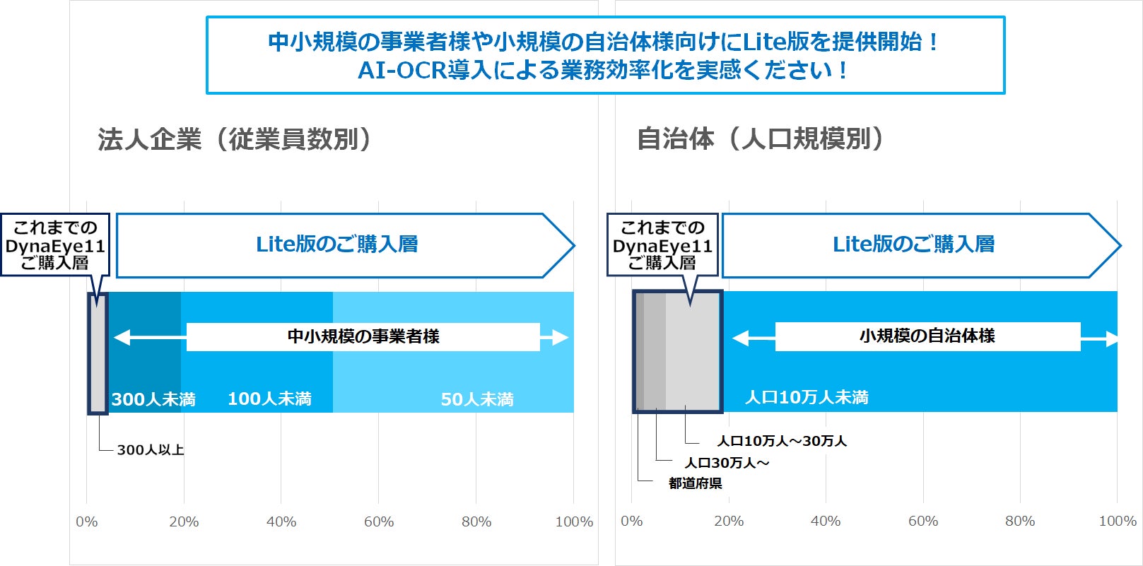 データ入力業務の効率化を目的にAI-OCRの導入が進んでおり、DynaEye 11も多くのお客様からご好評いただいております。一方、DynaEye 11をご購入いただいたお客様は大手企業や規模の大きな自治体が中心で、中小規模の事業者様や小規模の自治体様からは低価格で始められるAI-OCR商品を望む声もいただいておりました。
