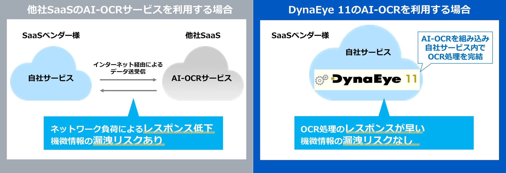 このライセンスをご購入いただくと、DynaEye 11 のAI-OCR機能をSaaSベンダー様のサービス内に組み込んでご利用いただけるため、AI-OCR機能を利用するためにインターネットを経由したサービス間のデータ送受信を行う必要がなくなります。AI-OCR処理が自社サービス内で完結できるため、セキュアな環境でレスポンスの早いAI-OCR機能の提供が可能となり、自社サービスの付加価値向上にお役立ていただけます。