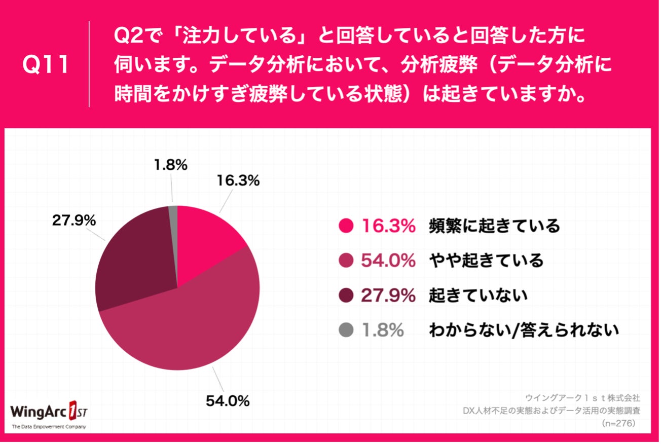 Q2で「注力している」と回答していると回答した方に、「Q11.データ分析において、分析疲弊(データ分析に時間をかけすぎ疲弊している状態)は起きていますか。」(n=276)と質問したところ、「頻繁に起きている」が16.3%、「やや起きている」が54.0%という回答となりました。