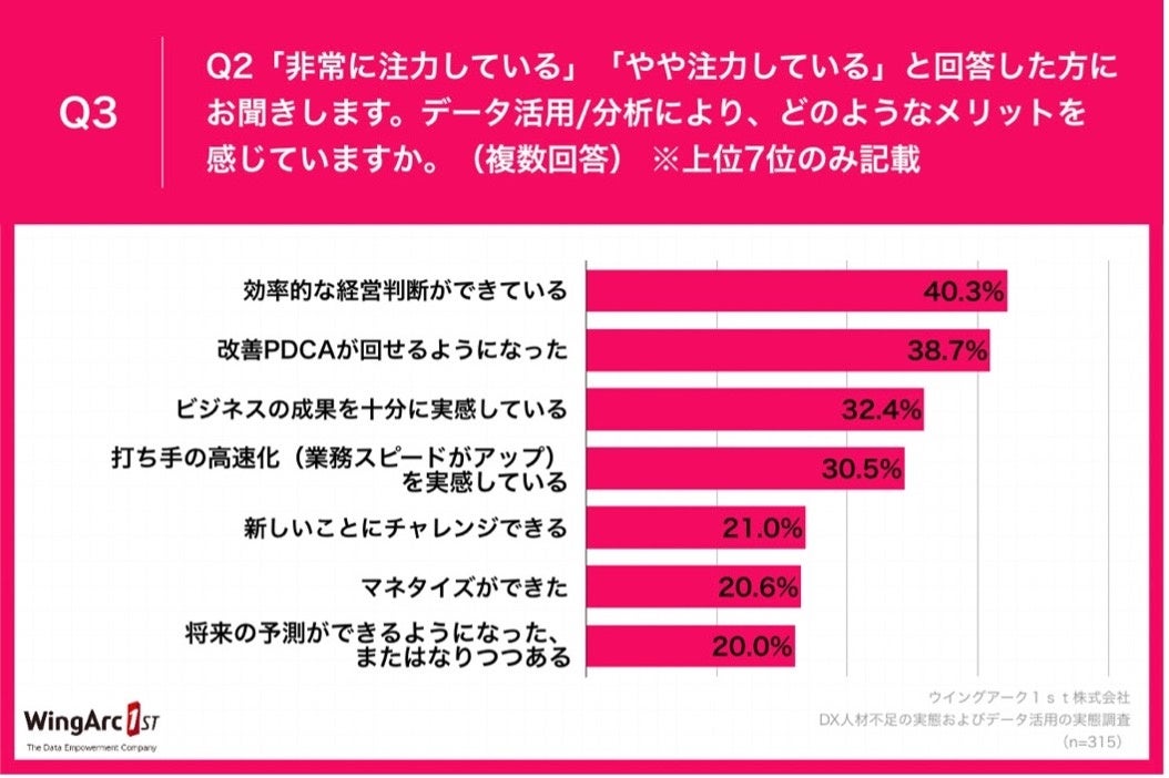 Q2「非常に注力している」「やや注力している」と回答した方に、「Q3.データ活用/分析により、どのようなメリットを感じていますか。(複数回答)」(n=315)と質問したところ、「効率的な経営判断ができている」が40.3%、「改善PDCAが回せるようになった」が38.7%、「ビジネスの成果を十分に実感している」が32.4%という回答となりました。
