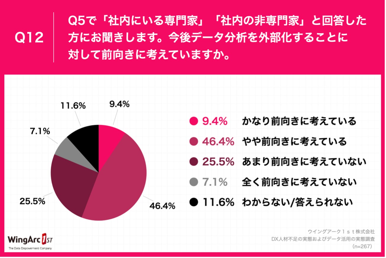 Q5で「社内にいる専門家」「社内の非専門家」と回答した方に、「Q12.今後データ分析を外部化することに対して前向きに考えていますか。」(n=267)と質問したところ、「かなり前向きに考えている」が9.4%、「やや前向きに考えている」が46.4%という回答となりました。