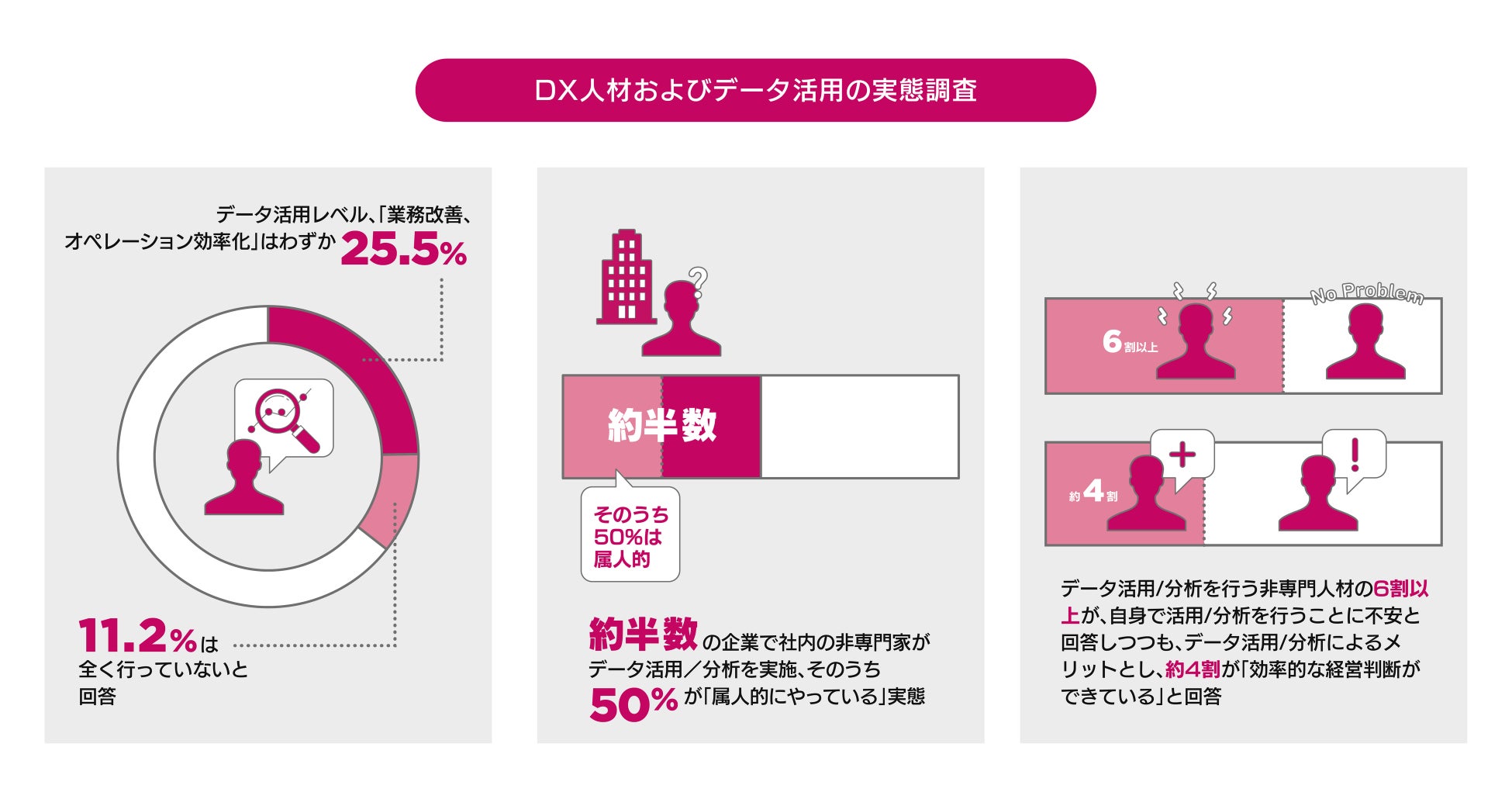日本においても積極的にデータ活用への投資をする企業も増えていますが、社内のデータ活用を専門家に任せる企業は少なく、実際にデータ活用に注力していない企業の多くの理由は「専門人材(DX人材)の不足」が挙げられました。また、データを分析できても活用にまで繋げることが難しく、属人的に行うことで分析疲弊を起こしやすい傾向もうかがえました。データ分析において外部人材の採用率はまだ低いものの、今後は有効なデータ活用の効果に期待する企業の役職者からは、社内の人材育成のためにも専門スキルのあるDX人材の起用に前向きになりつつあるようです。