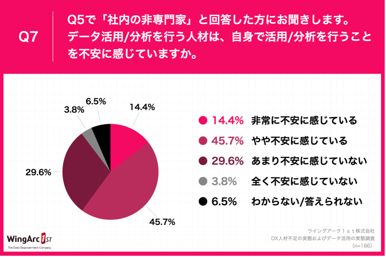 Q5で「社内の非専門家」と回答した方に、「Q7.データ活用/分析を行う人材は、自身で活用/分析を行うことを不安に感じていますか。」(n=186)と質問したところ、「非常に不安に感じている」が14.4%、「やや不安に感じている」が45.7%という回答となりました。
