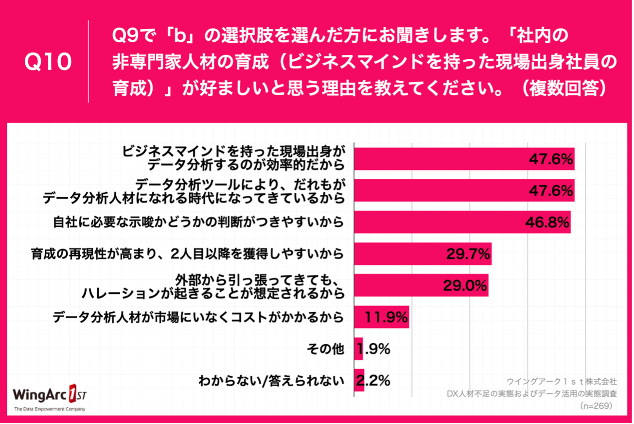 Q9で「b」の選択肢を選んだ方に、「Q10.「社内の非専門家人材の育成(ビジネスマインドを持った現場出身社員の育成)」が好ましいと思う理由を教えてください。(複数回答)」(n=269)と質問したところ、「ビジネスマインドを持った現場出身がデータ分析するのが効率的だから」が47.6%、「データ分析ツールにより、だれもがデータ分析人材になれる時代になってきているから」が47.6%、「自社に必要な示唆かどうかの判断がつきやすいから」が46.8%という回答となりました。