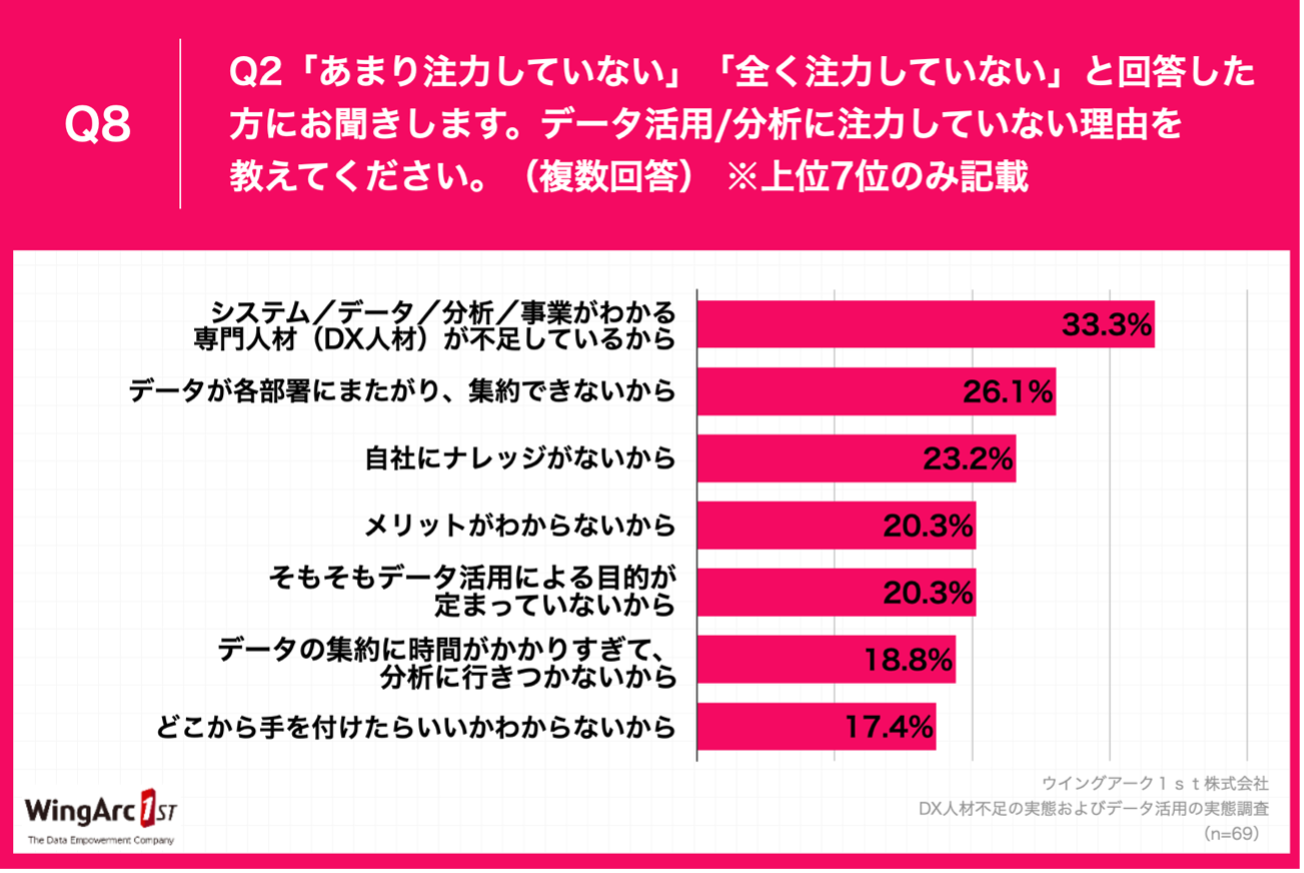 Q2「あまり注力していない」「全く注力していない」と回答した方に、「Q8.データ活用/分析に注力していない理由を教えてください。(複数回答)」(n=69)と質問したところ、「システム/データ/分析/事業がわかる専門人材(DX人材)が不足しているから」が33.3%、「データが各部署にまたがり、集約できないから」が26.1%、「自社にナレッジがないから」が23.2%という回答となりました。