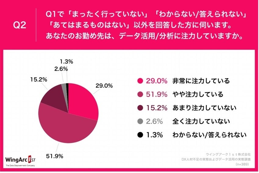 Q1で「まったく行っていない」「わからない/答えられない」「あてはまるものはない」以外を回答した方に、「Q2.あなたのお勤め先は、データ活用/分析に注力していますか。」(n=389)と質問したところ、「非常に注力している」が29.0%、「やや注力している」が51.9%という回答となりました。