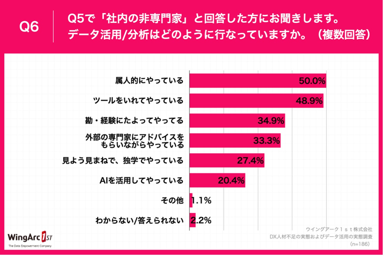 Q5で「社内の非専門家」と回答した方に、「Q6.データ活用/分析はどのように行なっていますか。(複数回答)」(n=186)と質問したところ、「属人的にやっている」が50.0%、「ツールをいれてやっている」が48.9%、「勘・経験にたよってやっている」が34.9%という回答となりました。