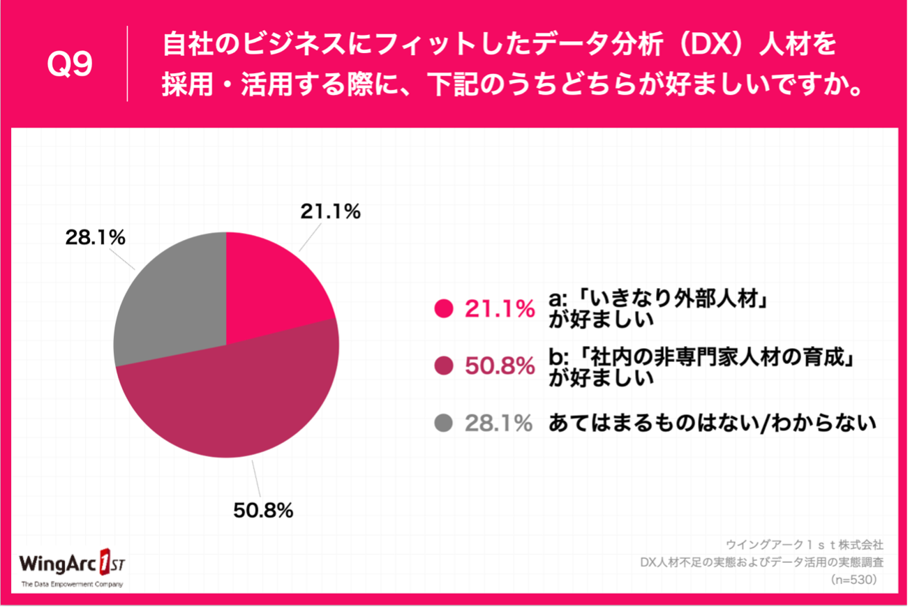 「Q9.自社のビジネスにフィットしたデータ分析(DX)人材を採用・活用する際に、下記のうちどちらが好ましいですか。」(n=530)と質問したところ、「a:「いきなり外部人材(優秀な外部人材を採用・活用)」が好ましい」が21.1%、「b:「社内の非専門家人材の育成(ビジネスマインドを持った現場出身社員の育成)」がいい」が50.8%という回答となりました。