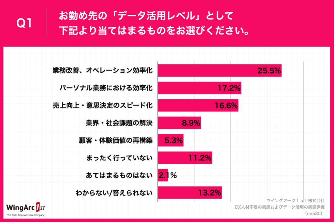 1.データ活用レベル、25.5%が「業務改善、オペレーション効率化」で留まり、11.2%は「全く行っていない」と回答