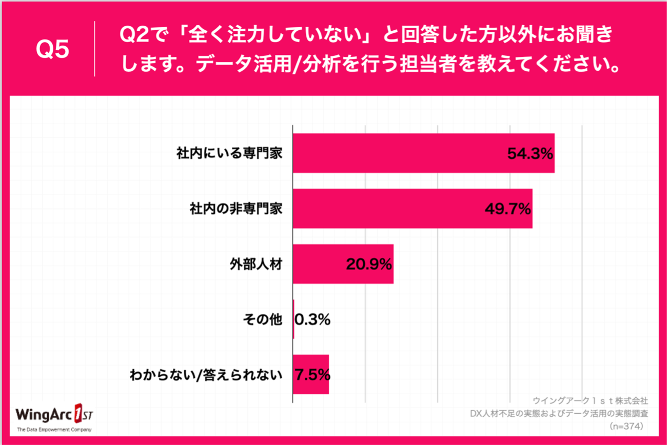 Q2で「全く注力していない」と回答した方以外に、「Q5.データ活用/分析を行う担当者を教えてください。」(n=374)と質問したところ、「社内にいる専門家」が54.3%、「社内の非専門家」が49.7%、「外部人材」が20.9%という回答となりました。