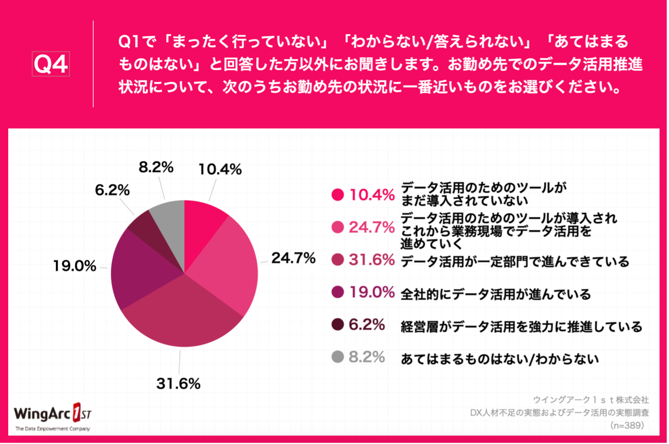Q1で「まったく行っていない」「わからない/答えられない」「あてはまるものはない」と回答した方以外に、「Q.4お勤め先でのデータ活用推進状況について、次のうちお勤め先の状況に一番近いものをお選びください。」(n=389)と質問したところ、「データ活用が一定部門で進んできている」が31.6%、「データ活用のためのツールが導入されこれから業務現場でデータ活用を進めていく」が24.7%という回答となりました。