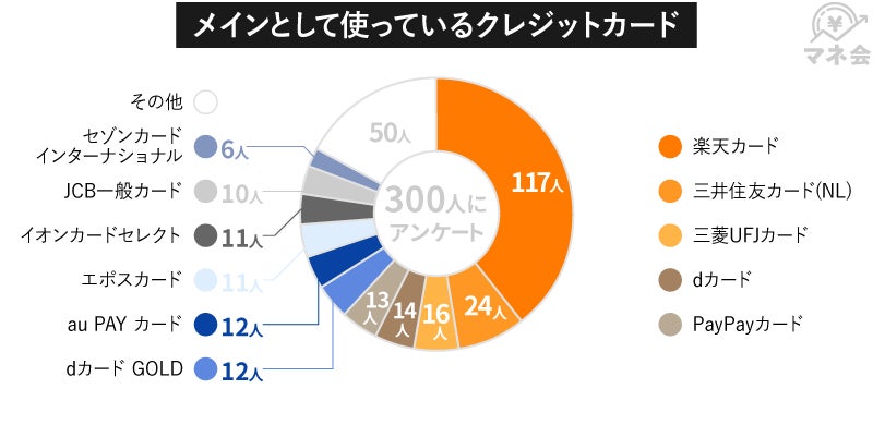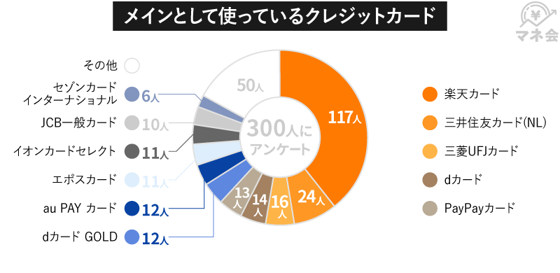 マネ会編集部がクレジットカードを保有している300名の方にアンケートと取ったところ、メインカードとして一番利用されているクレジットカードは楽天カードということがわかりました。117名とおよそ4割の方が利用しています。