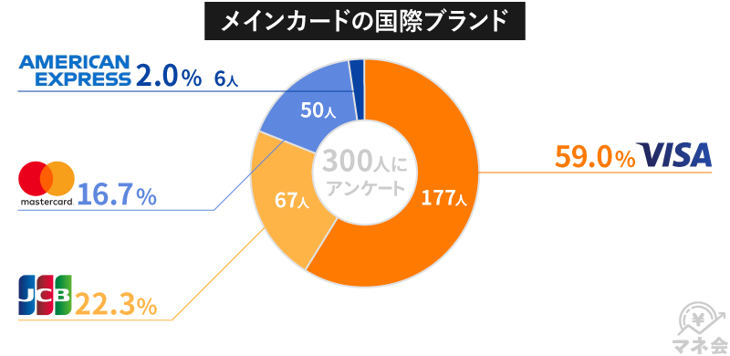 メインカードの国際ブランドについても調査したところ、このような結果になりました。1位はVISA、続いてJCB、Mastercard、American Expressという順です。VISAが半数以上を占め、多くの方に発行されていることがわかります。
