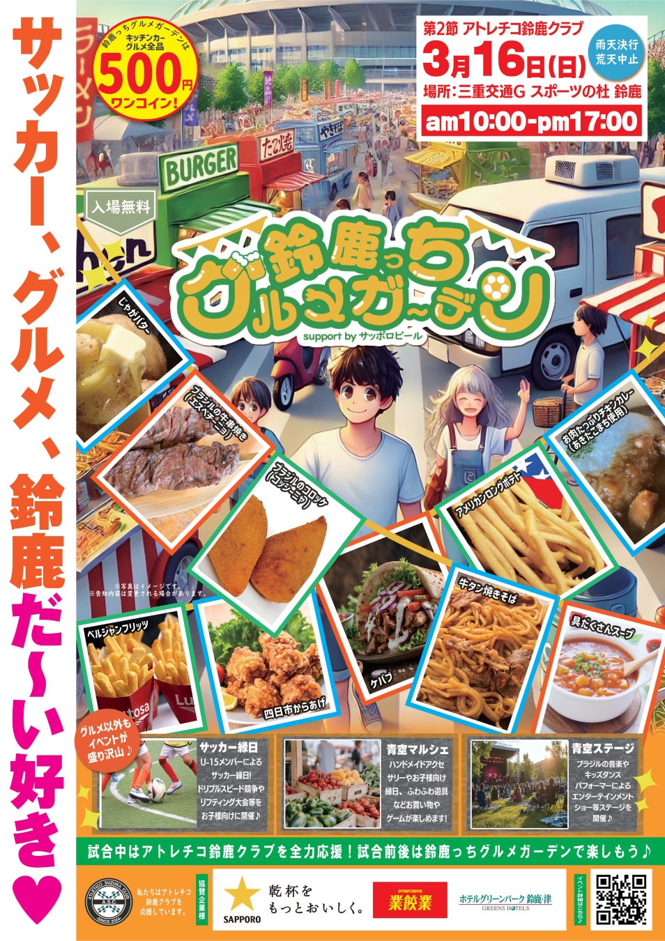 鈴鹿っちグルメガーデンは、三重県鈴鹿市を拠点とするサッカークラブ、アトレチコ鈴鹿クラブ公認のグルメイベントです。 このイベントは、サッカー観戦者だけでなく、サッカーに興味がない方々も楽しめる、幅広い客層へのレジャーの場を提供することを目的としています。2025年3月以降、アトレチコ鈴鹿のホームゲーム(全15試合)に合わせて開催される予定で、会場は主に三重交通G スポーツの杜 鈴鹿など、三重県内の複数エリアが予定されています。 鈴鹿っちグルメガーデンへの入場料は無料で、サッカー観戦チケットがなくても入場可能です。