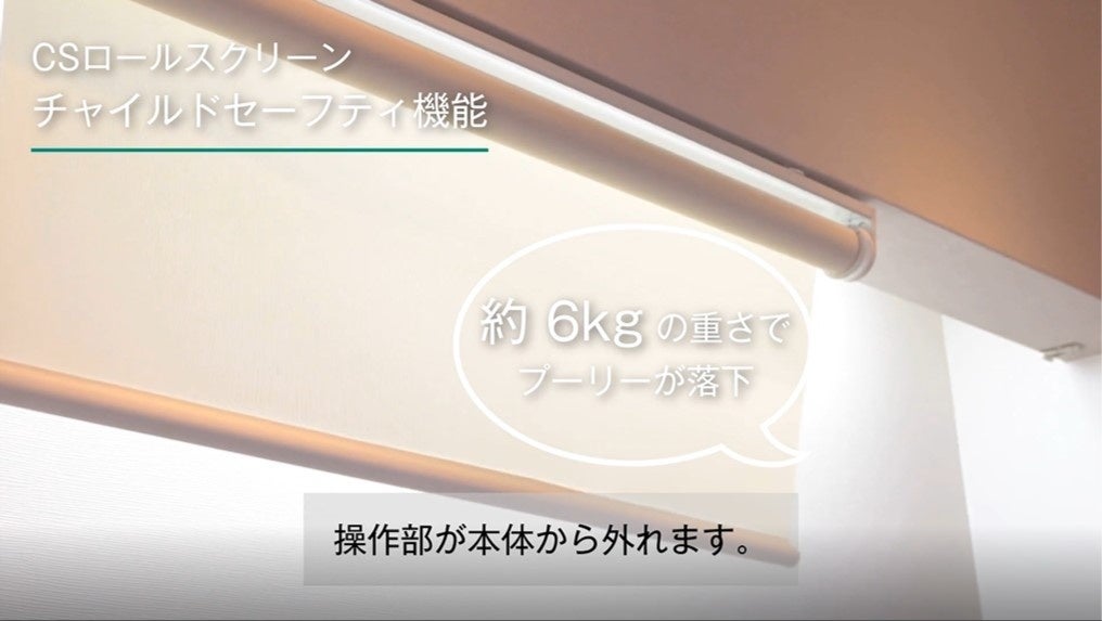 「CS(シーエス)ロールスクリーン」は、チェーン式のロールスクリーンで国内初となる、本体にチャイルドセーフティ機能を備えた商品です。ロールスクリーンの操作コードに6kg±1%の荷重が加わると、操作部が本体から外れ、不慮の事故を未然に防ぐ効果が期待できます。同商品は 2021 年9月に「第15回キッズデザイン賞」も受賞しています。