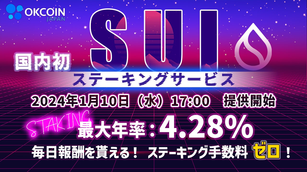 当社は、OKCoinJapan(暗号資産取引所)のステーキングサービスにおいて、『スイ(SUI)』を2024年1月10日(水)に追加することをお知らせいたします。また、2023年12月26日時点で、スイ(SUI)のステーキングサービスは国内初となります。(※自社調べ)