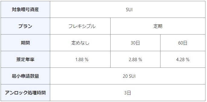 SUIのステーキングサービスでは、ロック期間の制限がない「フレキシブル」プランと、30日・60日のロック期間がある「定期」プランをご用意。60日の定期プランでは、最大年率4.28%のステーキング報酬を得ることができます。