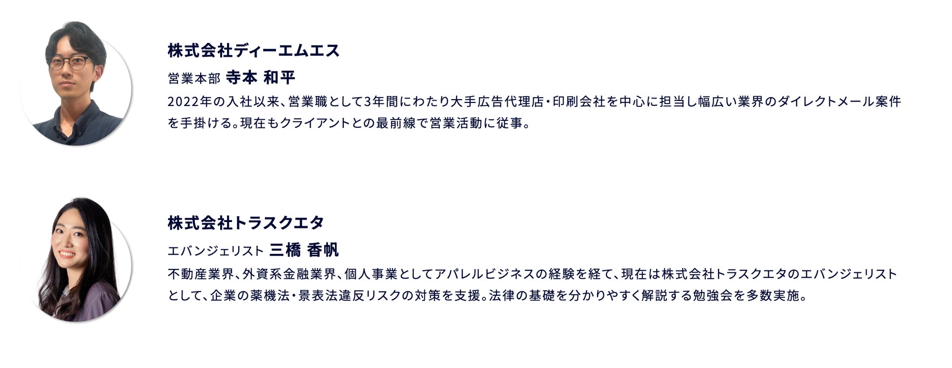 広告表現チェックツール「TRUSQUETTA」を提供する株式会社トラスクエタ(本社:東京都渋谷区、代表取締役CEO:高橋 聡)は、年間3.5億通以上のDM発送実績を有する株式会社ディーエムエス(本社:東京都千代田区、代表取締役社長:山本 克彦、東証スタンダード市場:証券コード9782) と共催で、「プロが教える !DM発送における郵便ルールと広告規制解説セミナー」と題したセミナーをオンラインにて開催します。