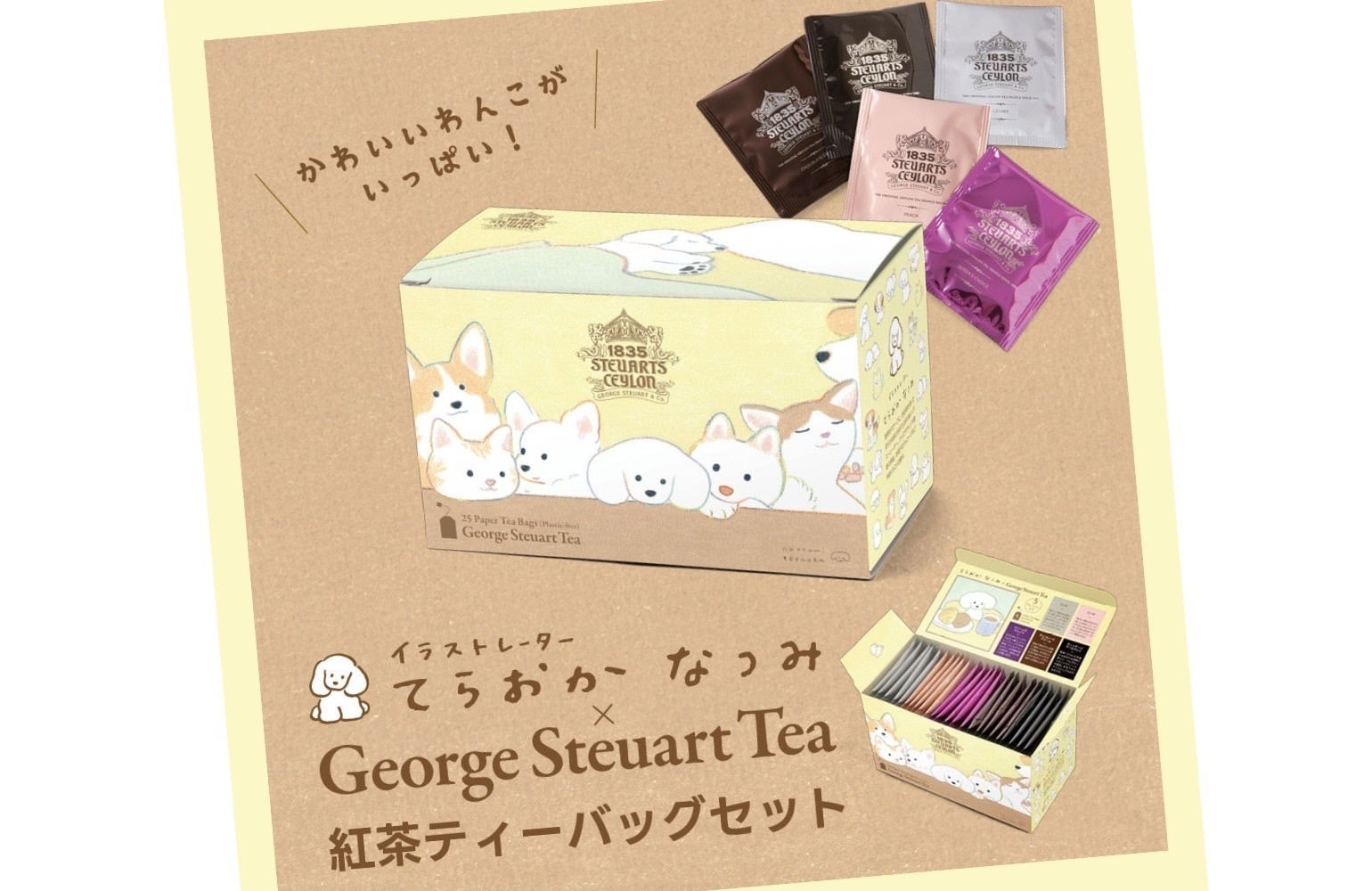 犬や動物をモチーフにした作品で人気のイラストレーター・てらおかなつみ氏と、ジョージスチュアートティがコラボしました。パッケージには表面だけでなく、天面や蓋裏にも愛らしいイラストがあしらわれ、癒しのわんこを眺めながら厳選紅茶をお楽しみいただけます。さらに、ひと箱に1枚、てらおかなつみ氏描き下ろしの“紅茶モチーフのミニシール”入り。どのイラストが入っているかは、開けてからのお楽しみ♪(税込1,890円/1個)