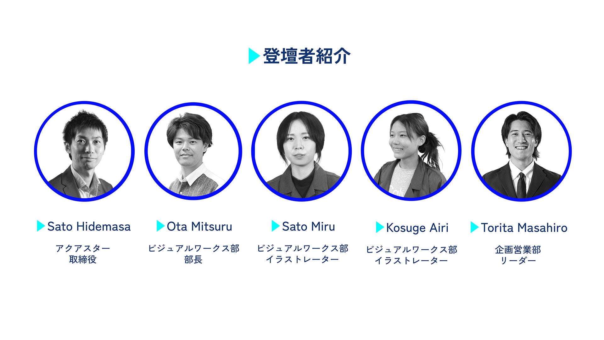 ・登壇者:アクアスター取締役 佐藤秀政、ビジュアルワークス部 部長 太田光、ビジュアルワークス部リーダー 佐藤美瑠 ビジュアルワークス部 小菅愛理、企画営業部 リーダー酉田将宏