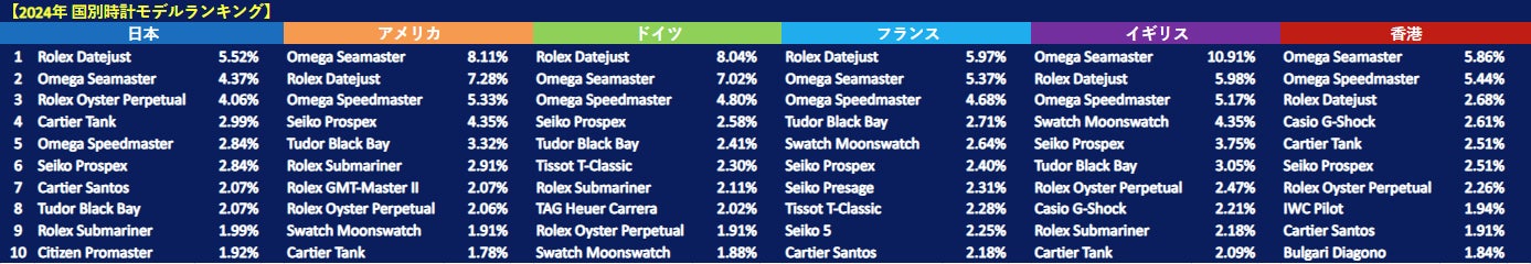 モデル別に見てみても、ロレックスのデイトジャストは、ドイツ(8.04%)、フランス(5.97%)、日本(5.52%)などでトップの選択肢として際立っています。他の人気モデルであるサブマリーナやオイスター・パーペチュアルも頻繁にトップ10に登場。根強い人気ぶりがうかがえます。