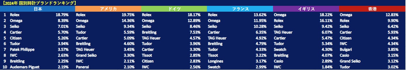 ロレックスはほとんどの地域で依然として支配的な存在であり、市場シェアで常に1位を維持しています。例えば2024年には、アメリカ(19.75%)、ドイツ(18.17%)、日本(18.79%)、フランス(13.62%)でロレックスがリードしました。また、ほぼすべての国でのロレックスのシェアが昨年に比べ下がっているのに比べ、日本では上昇しているのが非常に特徴的です。