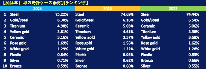 スチールは依然として最も人気のある素材であり、2024年にはそのシェアが75.22%とわずかに上昇しています。ゴールド/スチールの組み合わせは安定して2位を維持しており、チタンのシェアは4.98%に増加。軽量かつ耐久性のある素材への関心が高まっていることを示しています。一方、2022年、23年と5%以上を獲得していたセラミックは、2024年には3.16%に減少しており、ハイテク素材への需要が減少している可能性があります。