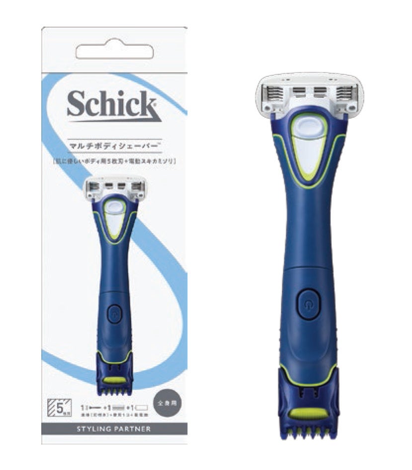 「マルチボディシェーバー」は、毛を剃るための「ボディ用5枚刃カミソリ」と、毛を梳くための「電動スキカミソリ」が1本にまとまった「剃るも梳くも、全身これ一本」のボディ用シェーバーです。