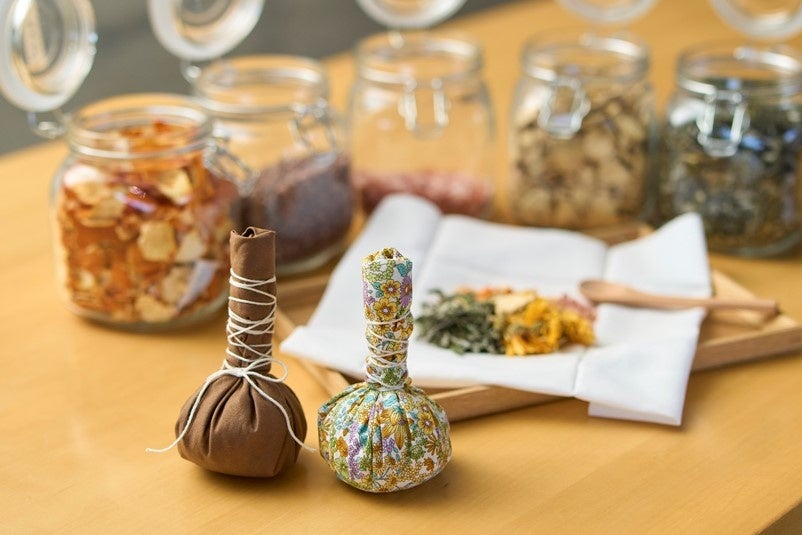 お好みの天然ハーブをコットン生地で包みボール状にしたセルフケアアイテムを作る「ハーブボールづくり」。身体の体調に合わせたハーブを選び、香りを楽しみながらハーブボールを作ります。完成したハーブボールは、温めて肩や目の周りなどに当てると疲労感が安らぎます。10日~2週間を目安に繰り返し使えるのでご帰宅後もセルフケアに使用いただけます。