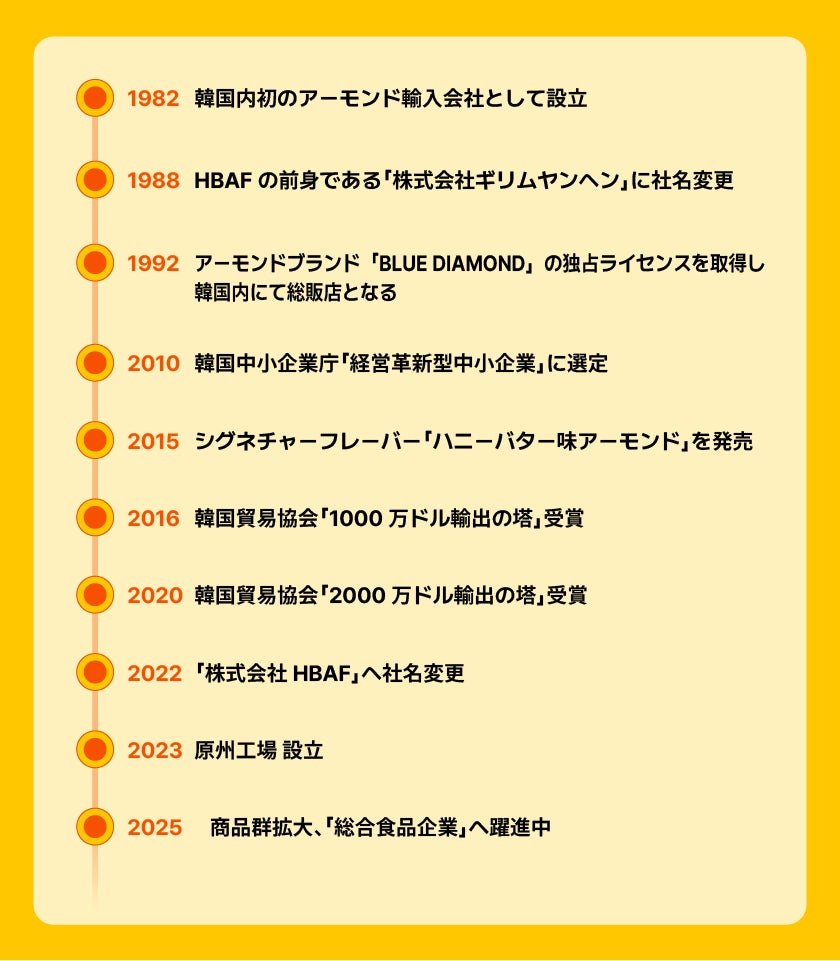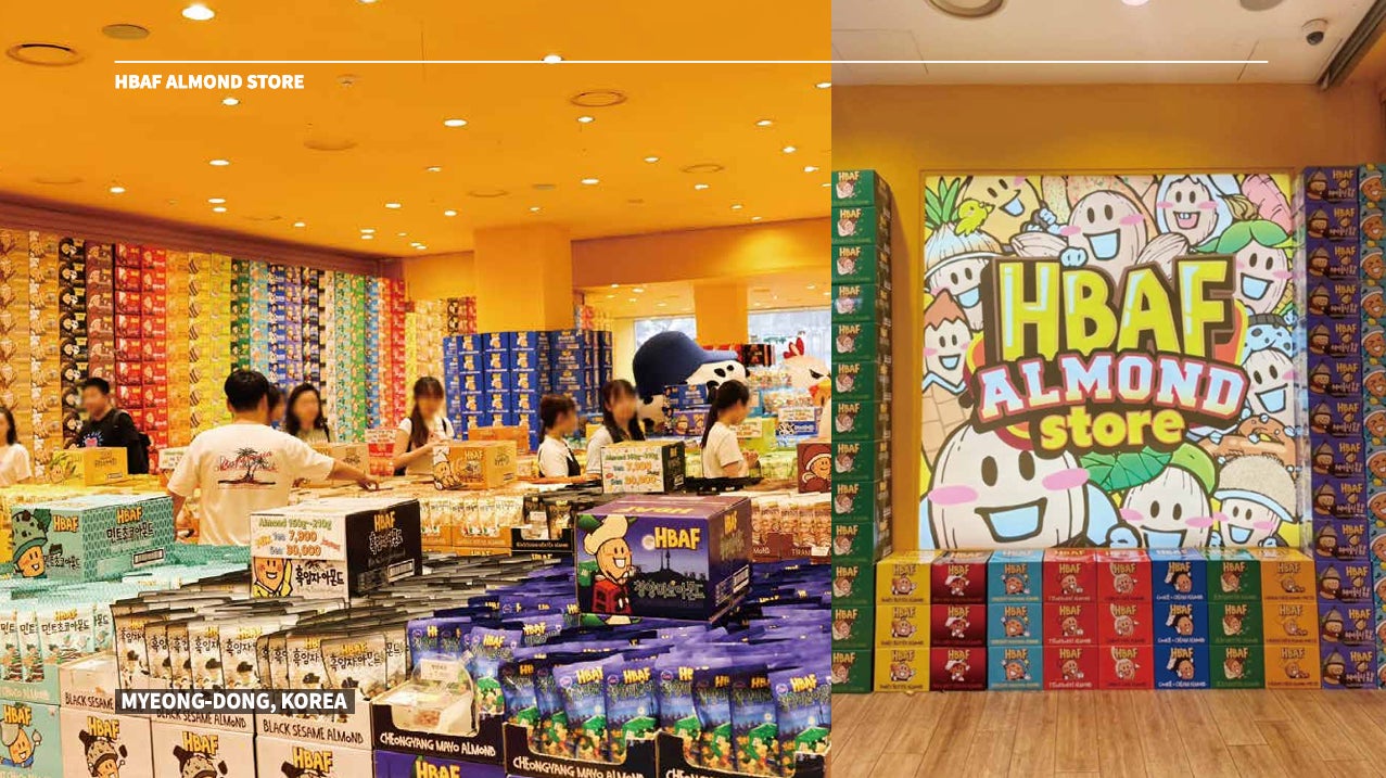 1982年に韓国で設立され、現在は世界25カ国にアーモンドを輸出する韓国最大のナッツブランドへと成長しました。2015年にはシグネチャーフレーバーである「ハニーバターアーモンド」を発売し、その“絶妙な甘じょっぱさがクセになる”味わいで韓国国内において爆発的なヒットを記録。今では世界各国で K-ALMONDを代表するブランド として確固たる地位を築いています。