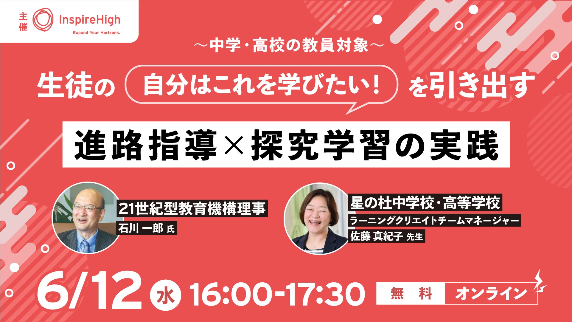「世界とつながる探究的な学びを手軽に教室で」をコンセプトとしたEdTech教材を提供する株式会社Inspire High(本社:東京都千代田区、代表:杉浦太一)は、進路指導・探究学習の実践事例を紹介する中高教員向けのオンラインセミナーを6/12(水)に開催します。
