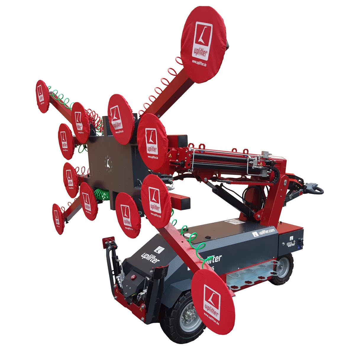 「グラスワーカー」は、建築中の建物のガラスや建材パネルを吸盤で吸着し、そのまま窓枠や壁面にはめ込むことができる、自走式アーム型の遠隔作業用機械です。リモコン操作のため、取り付け場所のすぐ近くで操作ができ、効率よく設置が可能です。ブームの上げ下げ、伸縮、縦横左右の首振り、旋回ができるほか、吸着している部分が真横に水平移動するため、はめ込む際の微調整が可能なことが特徴です。