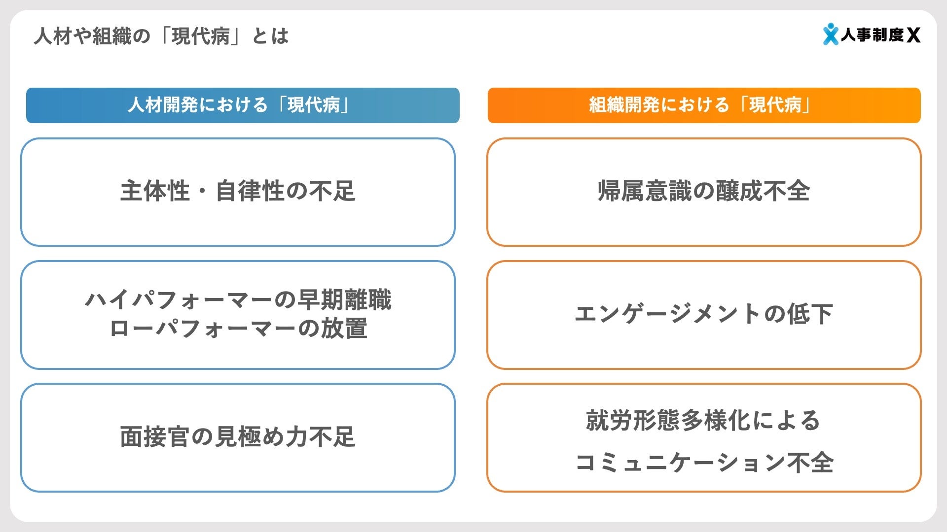 制度間の一貫性がなく機能不全に陥る(例:人事評価制度・育成・採用が食い違う論理で作られている等)
