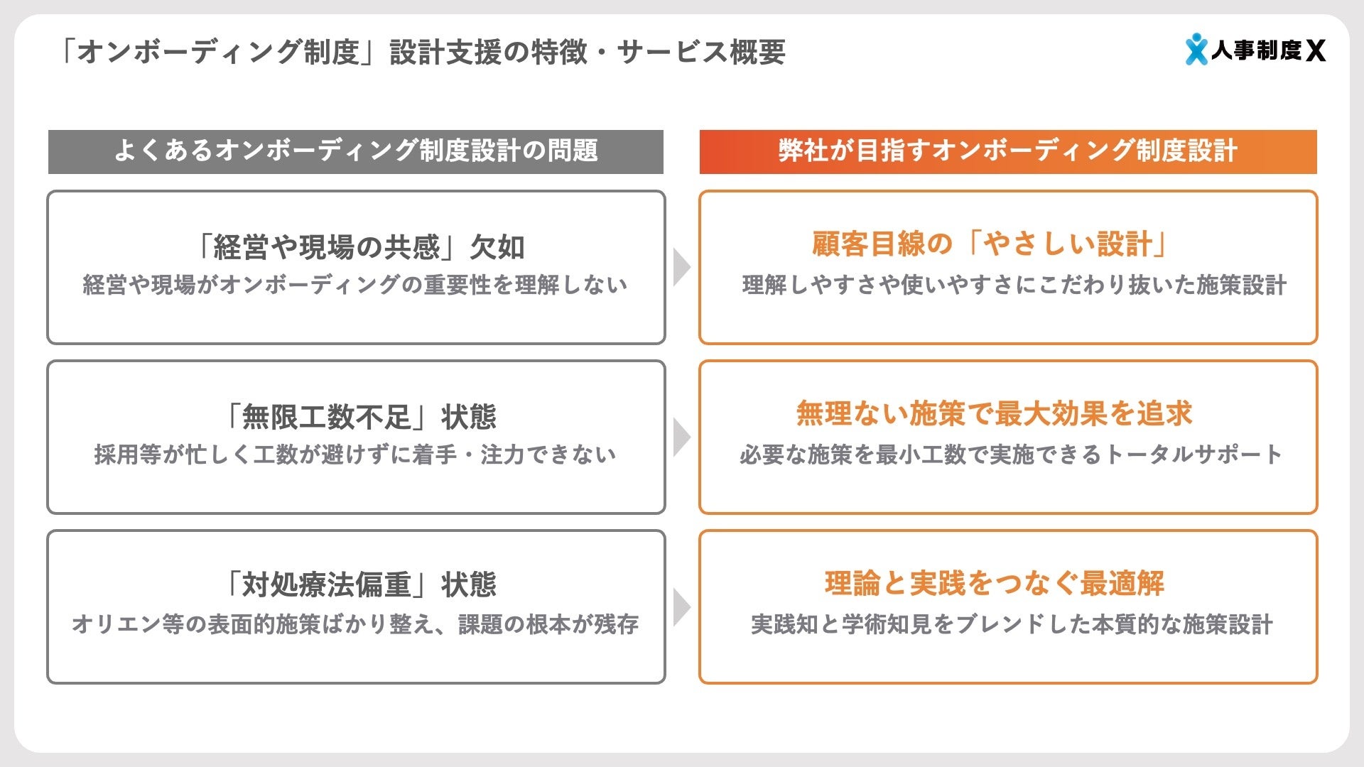 人事制度Xでは、顧客目線での「やさしい設計」と最小限の工数で最大の効果を生む仕組みを提供し、本質的な制度設計で理念と実践をつなぐオンボーディング支援を実現します。