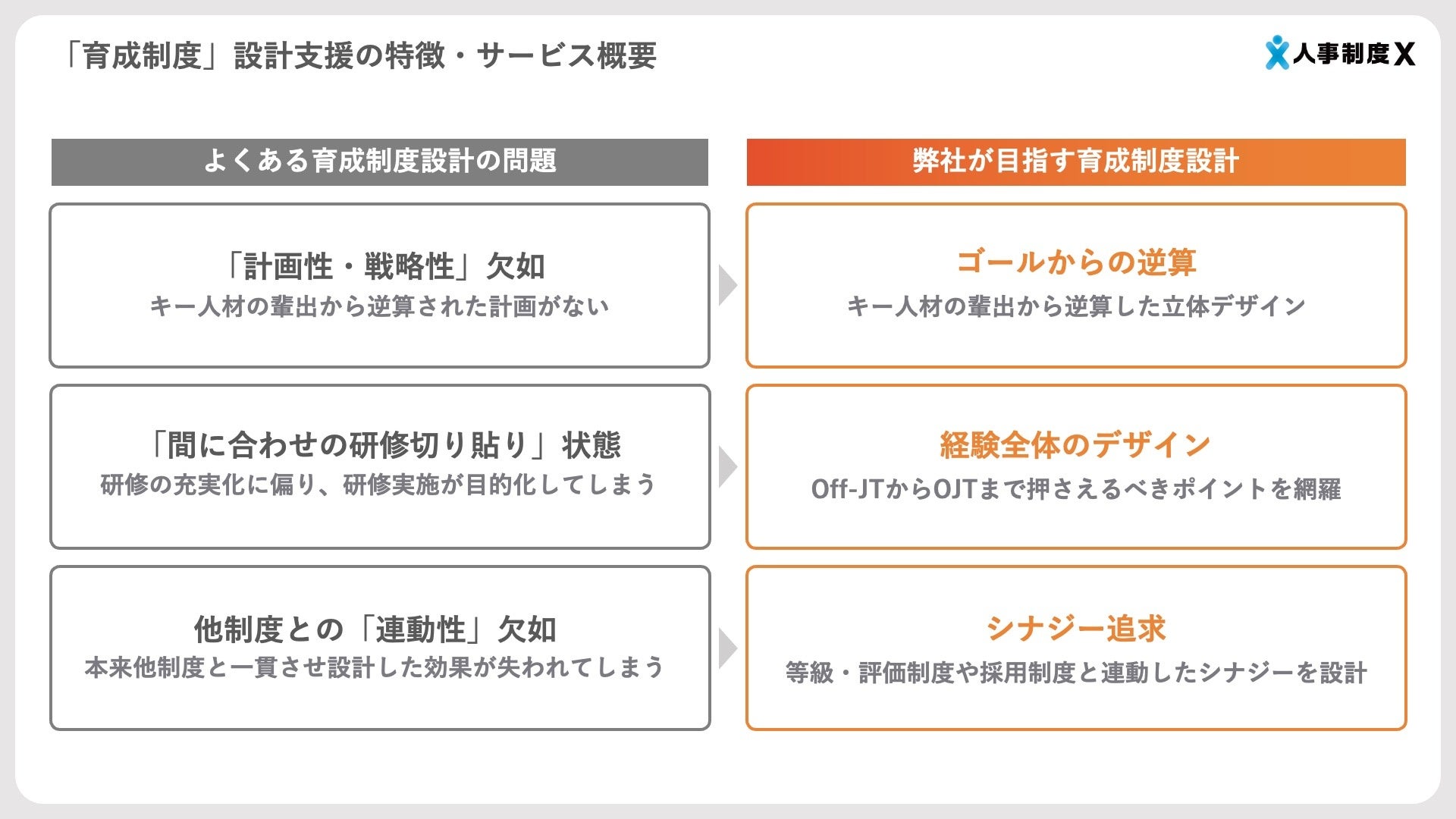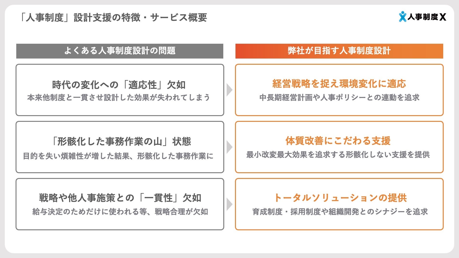 本サービスは、人事制度・採用制度・オンボーディング制度・育成制度といった企業内の基幹制度を、経営戦略に基づき設計・運用まで伴走する“実行支援型コンサルティング”です。