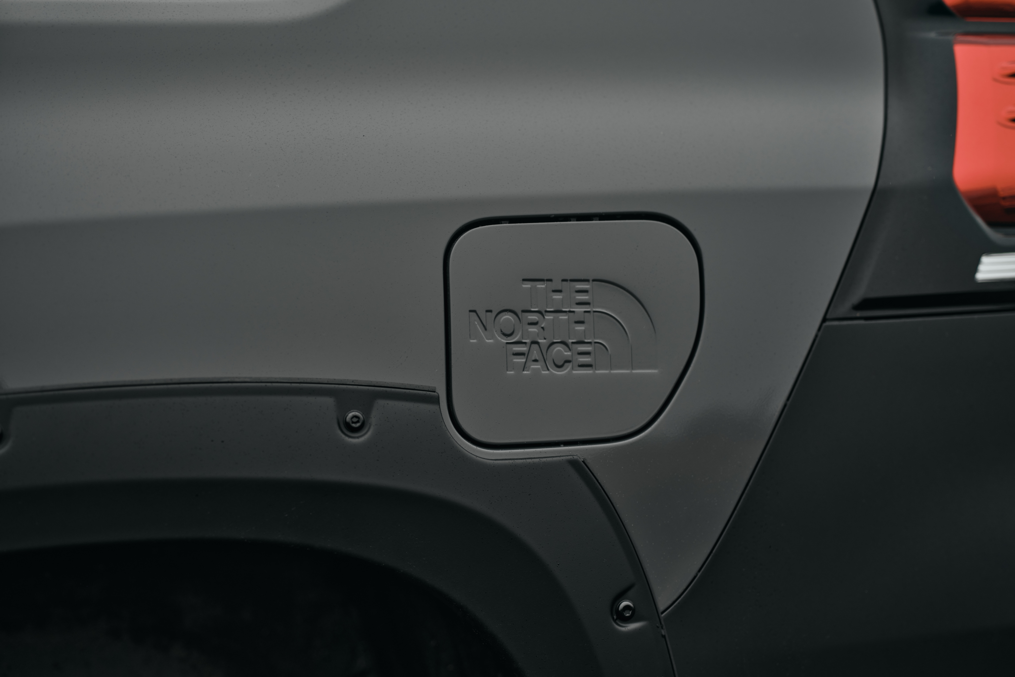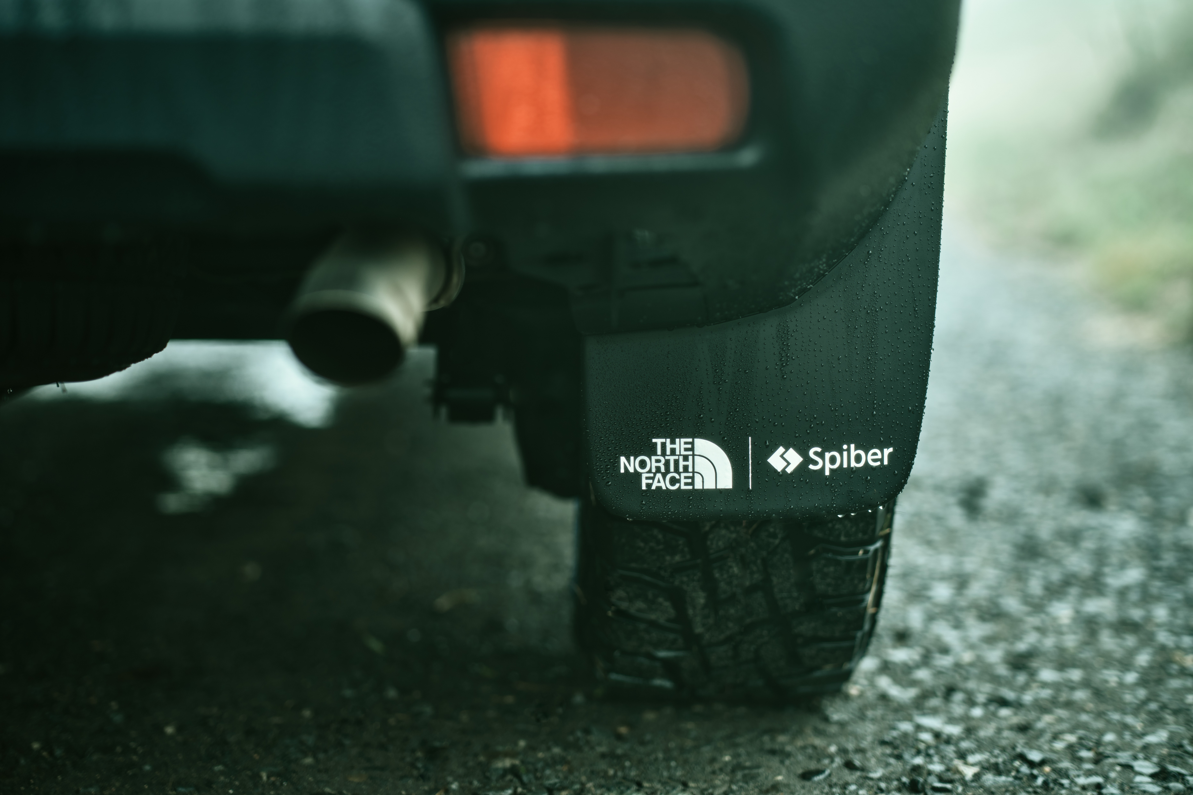 フューエルリッド(給油口の蓋)には、THE NORTH FACEのロゴをインクリメンタルフォーミング(逐次成形加工技術)で入れることで、さりげなく主張。足回りは、タイヤ・ホイールをオールブラックで統一。マッドガードにTHE NORTH FACEとSpiberのロゴを入れることで、後ろから見た際のスタイルも計算されています。