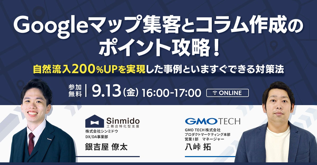 Googleマップ集客とコラム作成のポイント攻略! ~自然流入200%UPを実現した事例といますぐできる対策法~ウェビナー!