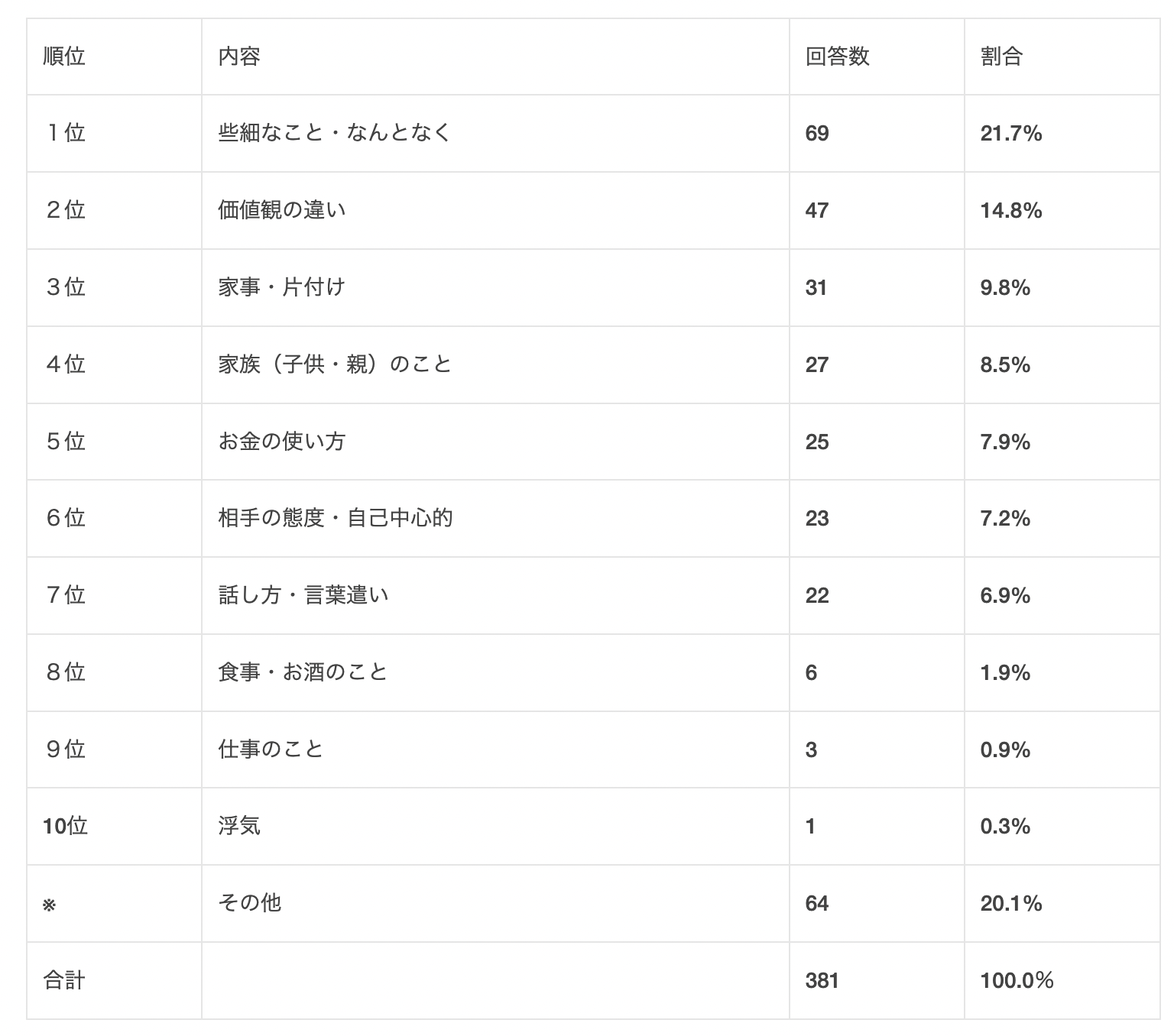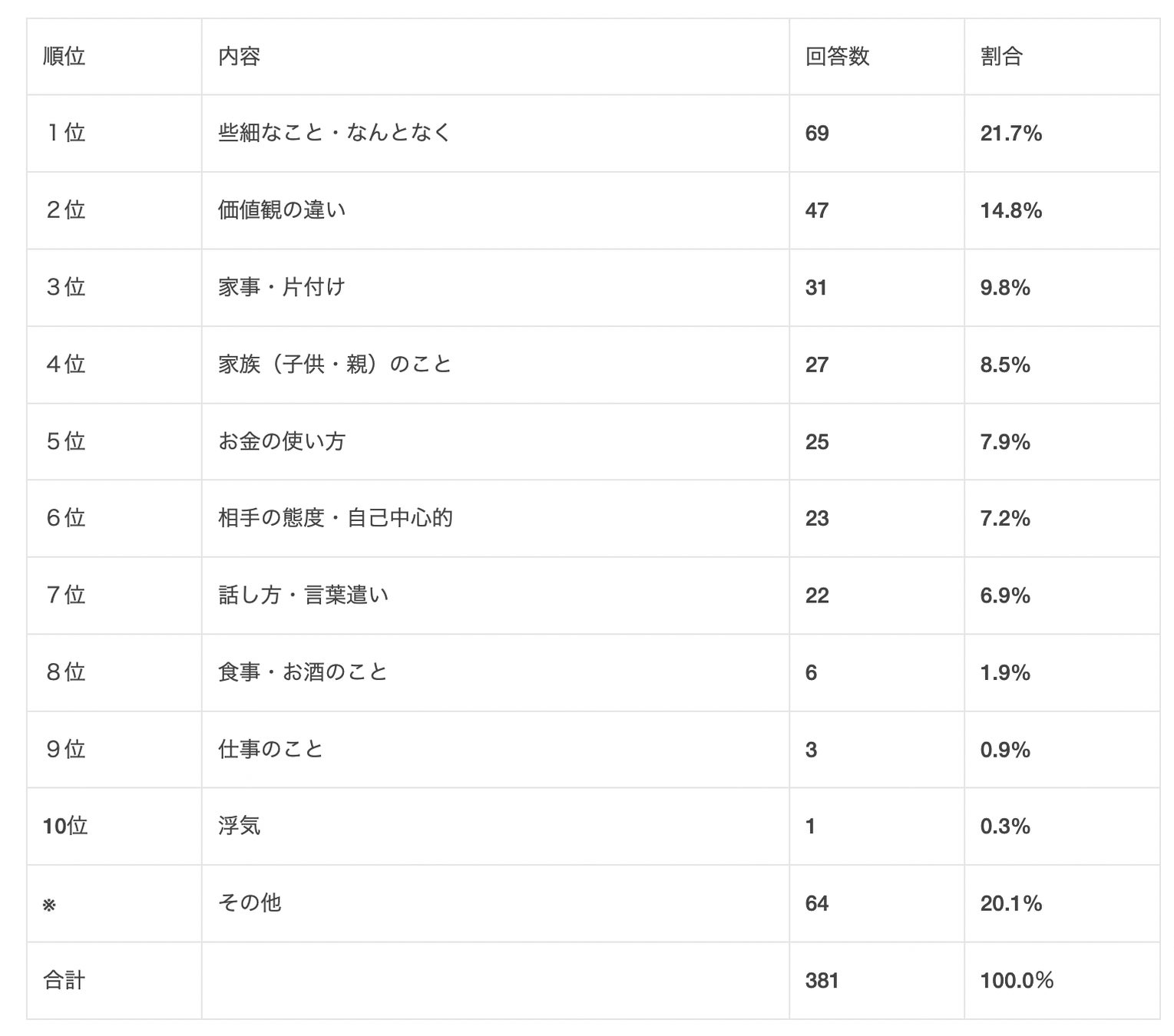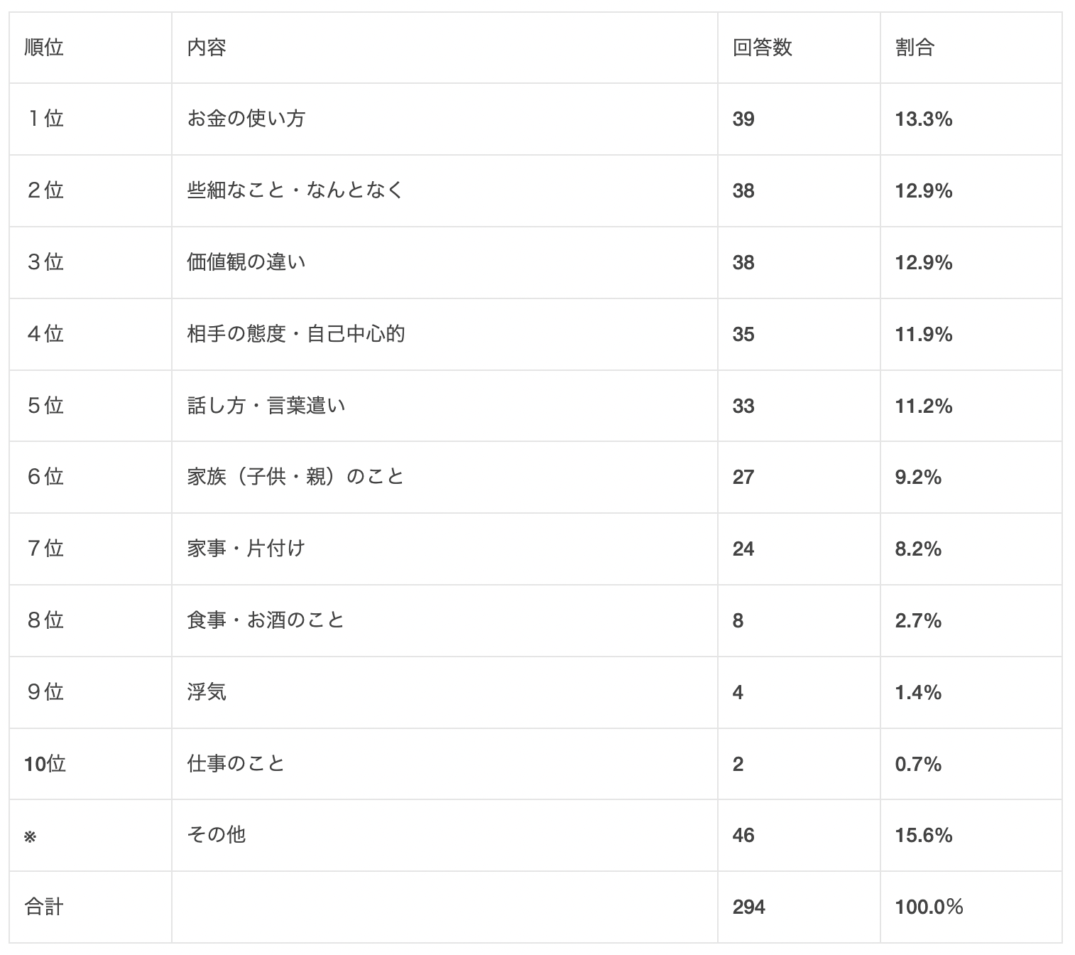 続いて2位「価値観の違い」・3位「家事・片付け」がトップ3の回答です。以下「家族のこと」「お金」「相手の態度」「話し方」となっています。