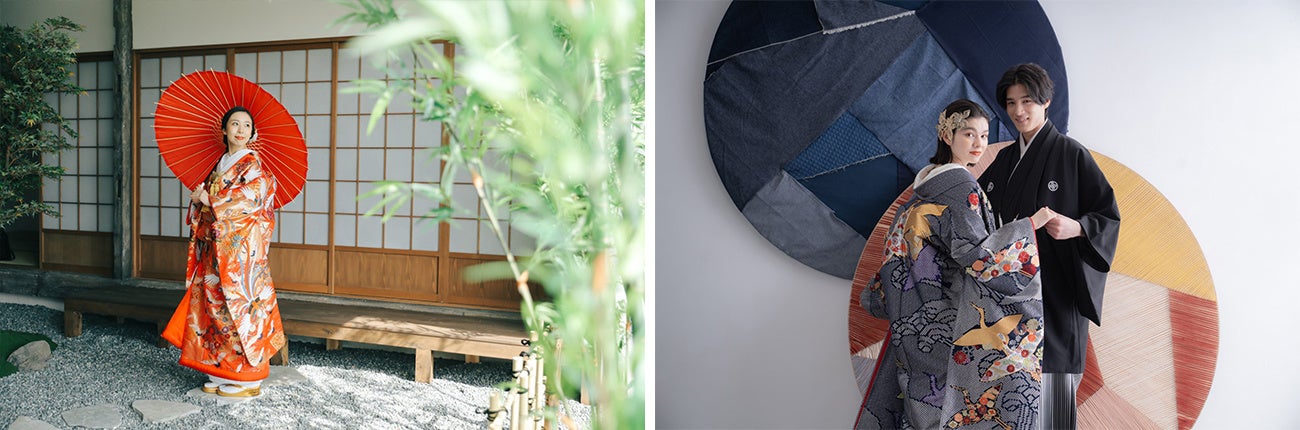 屋内庭園スタジオは竹を入れ玉砂利を敷き詰めることで、よりリアルに和庭園を再現。ロケーション撮影のような写真が撮れるほか、宮大工が手掛けた本格的な茶室、デニム素材を取り入れたモダンな背景などもあり、伝統とモダンを融合させたこれまでにないスタジオです。