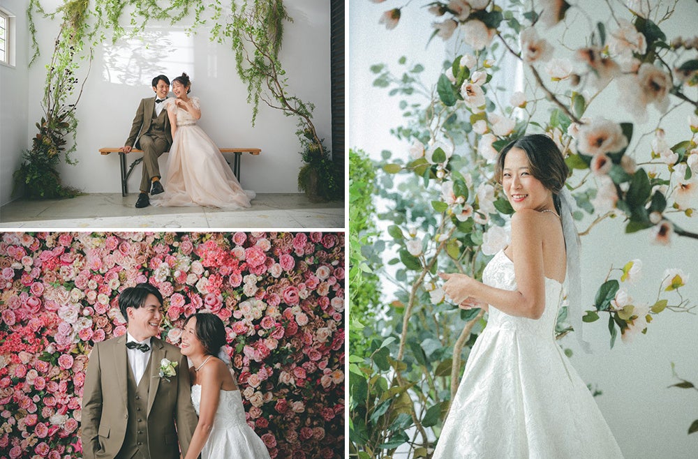以前よりご好評いただいている、ピンクベースのお花で彩られたフラワーウォールでの撮影ももちろん可能。かわいらしい雰囲気から上品な雰囲気まで、1つのハウススタジオ内でさまざまなイメージの撮影をお楽しみいただけます。