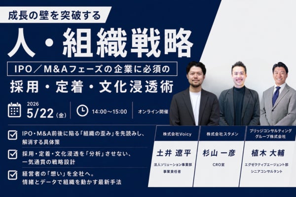 ブリッジコンサルティンググループ株式会社(本社:東京都港区、代表取締役CEO:宮崎 良一)は、株式会社Voicy(本社:東京都渋谷区、代表取締役CEO:緒方 憲太郎)、株式会社スタメン(本社:東京都千代田区、代表取締役:大西 泰平)と共同で、2026年5月22日(金)にオンラインセミナー「成長の壁を突破する『人・組織戦略』〜IPO/M&Aフェーズの企業に必須の採用・定着・文化浸透術〜」を開催いたします。