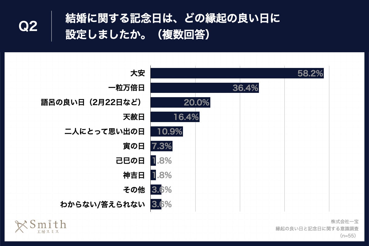 Q1で「かなり意識した」「やや意識した」と回答した方に、「Q2.結婚に関する記念日は、どの縁起の良い日に設定しましたか。(複数回答)」(n=55)と質問したところ、「大安」が58.2%、「一粒万倍日」が36.4%、「語呂の良い日(2月22日など)」が20.0%という回答となりました。