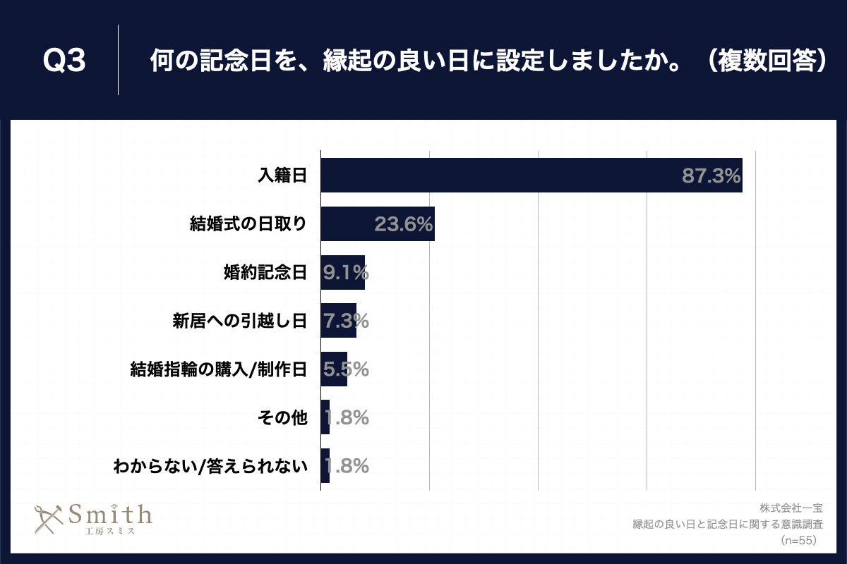 Q2で「かなり意識した」「やや意識した」と回答した方に、「Q3.何の記念日を、縁起の良い日に設定しましたか。(複数回答)」(n=55)と質問したところ、「入籍日」が87.3%、「結婚式の日取り」が23.6%、「婚約記念日」が9.1%という回答となりました。