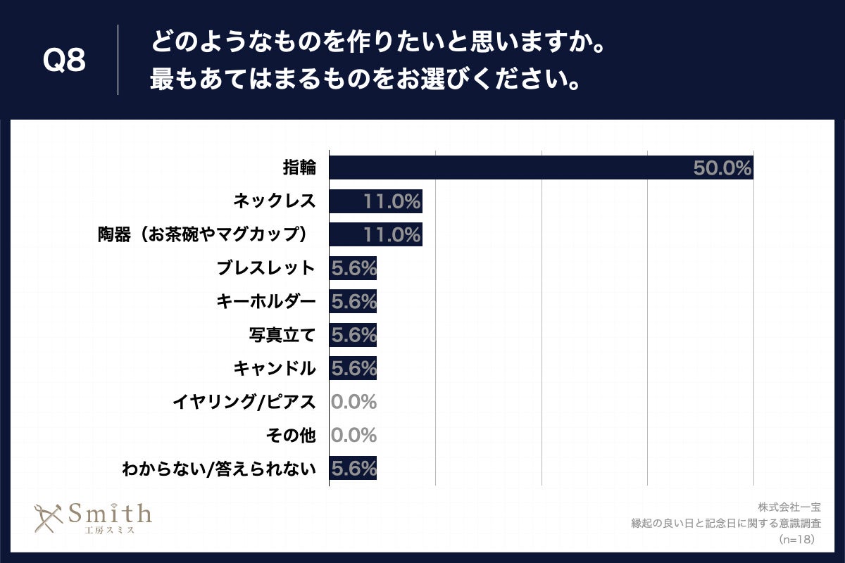 Q7で「二人で記念の品を作りたい」と回答した方に、「Q8.どのようなものを作りたいと思いますか。最もあてはまるものをお選びください。」(n=18)と質問したところ、「指輪」が50.0%、「ネックレス」が11.0%、「陶器(お茶碗やマグカップ)」が11.0%という回答となりました。