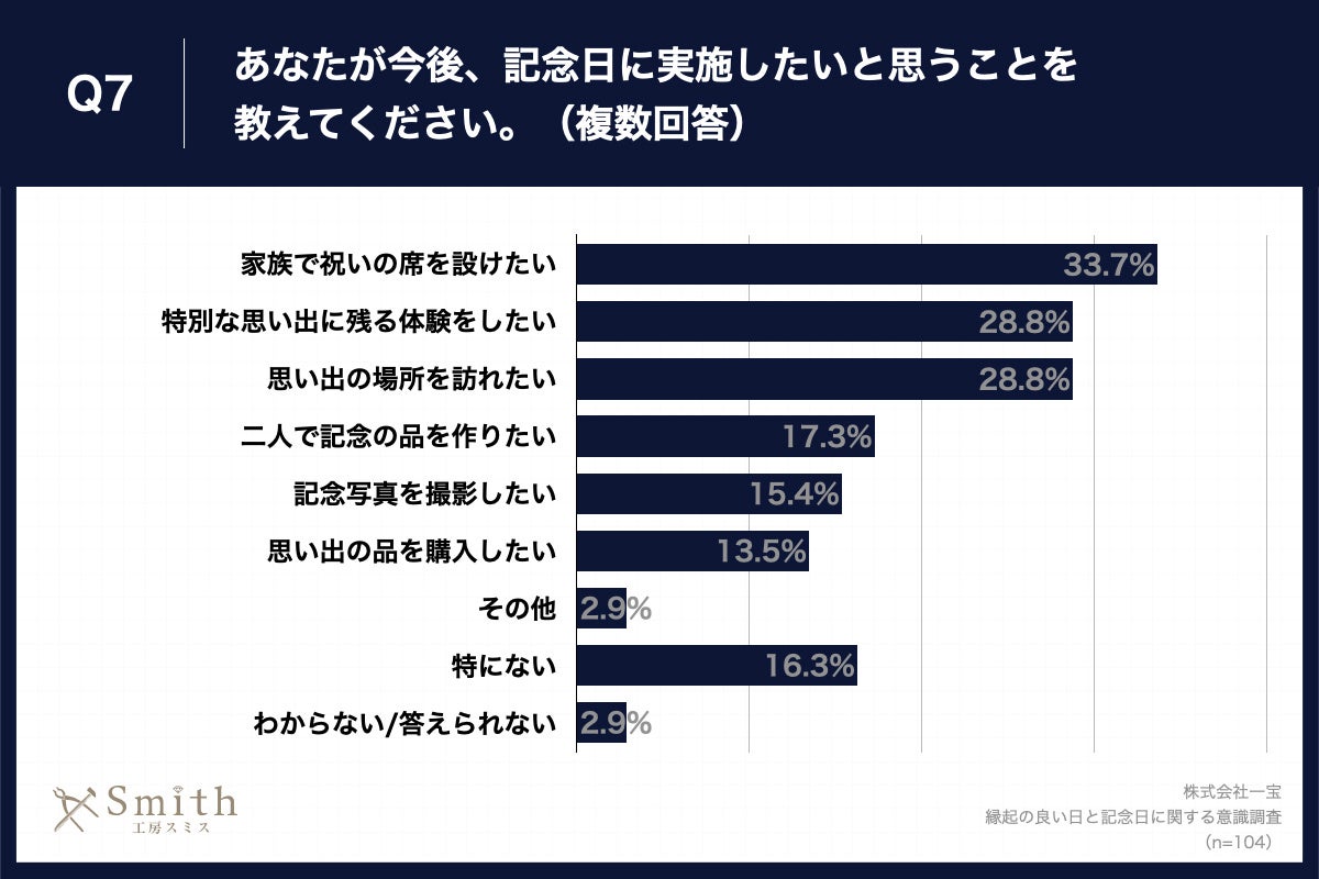 「Q7.あなたが今後、記念日に実施したいと思うことを教えてください。(複数回答)」(n=104)と質問したところ、「家族で祝いの席を設けたい」が33.7%、「特別な思い出に残る体験をしたい」が28.8%、「思い出の場所を訪れたい」が28.8%という回答となりました。