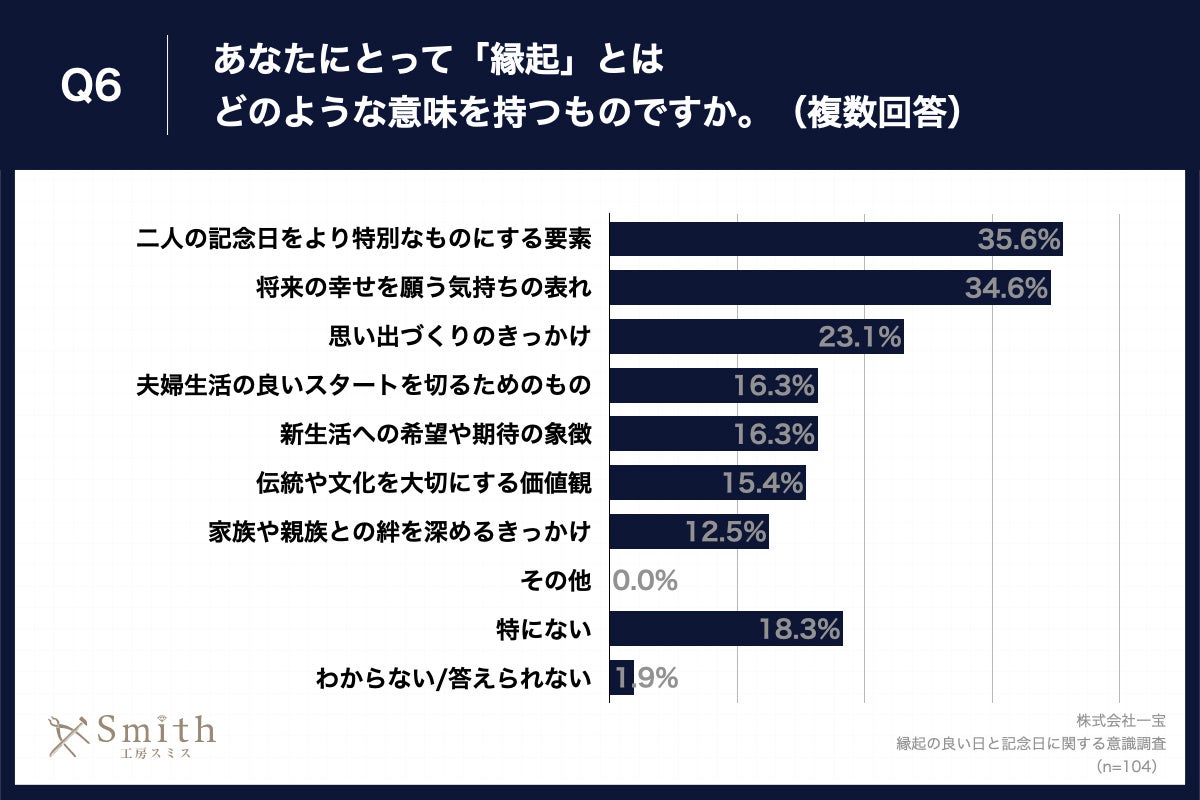 「Q6.あなたにとって「縁起」とはどのような意味を持つものですか。(複数回答)」(n=104)と質問したところ、「二人の記念日をより特別なものにする要素」が35.6%、「将来の幸せを願う気持ちの表れ」が34.6%、「思い出づくりのきっかけ」が23.1%という回答となりました。